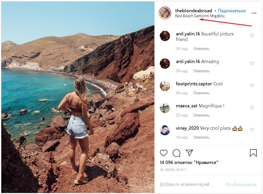 Этот блогер из Instagram отметил местоположение, как Красный пляж Санторини, в Греции.